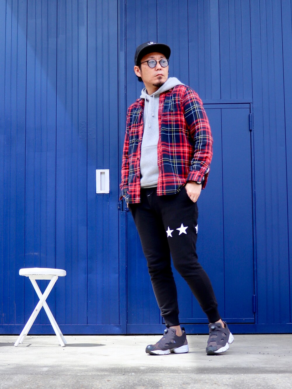 赤チェックシャツとパーカーの重ね着 ✖︎ブラックスウェット ✖︎リーボックポンプ の春コーデ😆👍