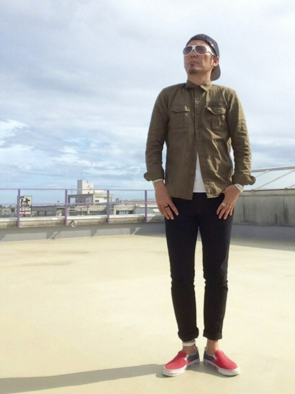 あっ😆 しまったぁぁぁぁぁ〜😅 途中なのに…アップしてしまった😱 今日のコーディネートは カーキ✖️ブラック✖️レッド 珍しく、カーキコーデ👕 今までは、避けていたカーキコーデがブラックスキニーと合わせたらしっくりきたぁ〜😁👍 これなら、カーキのMA-1を買おうかなぁ〜😙 シャツのボタンを1番上までと 小窓には、シャツを開いたバージョンをアップ📸 だいぶイメージが変わる😆 トップス:ミリタリーシャツ(GU) ➕ インナー:Tシャツ(moery sport) ➕ ボトムス:クラッシュスキニーデニム(GU) ➕ シューズ:スリッポン(VANS) ➕ 帽子:キャップ(7Union) ➕ ファッション雑貨:サングラス(moery sport)