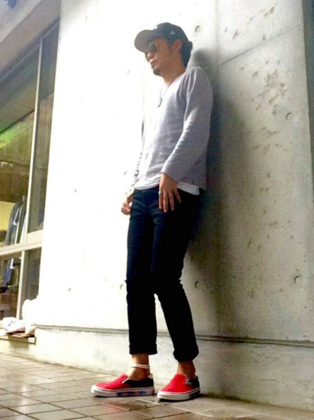 大人色気出し部に入部させていただきます。 発足メンバーの皆さん、よろしくお願いします。 40過ぎの俺等に、色気出していかないと😆 哀愁と言う名の色気でてますかね😅 今日のコーデは トップスをグレーとホワイトのレイヤードで『定番のモノトーンコーデ』 足元に差し色の赤で、メリハリ🤗