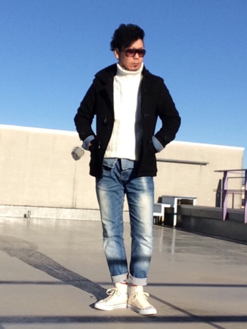 こんばんは🌆 今日は、クライアントと打ち合わせの為 少し、キレイ目コーデ ポイントは、太めのデニムをロールアップ そして、トリコロールラインソックスをチラ見せ👀 さらに、タートルネックニットの下はデニムシャツ👔 見えないけど、デニムオンデニム😆👍