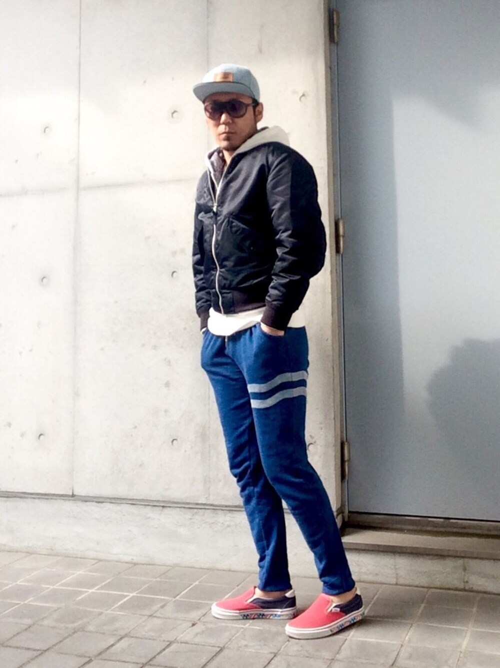 ネイビーワントーンコーデ📸 『MA-1✖️ネイビースウェットパンツ』 間に、ホワイトを入れた レイヤードスタイル👖 さらに、 ホワイトパーカーの裏地のバンダナ柄がオシャレポイント😆👍