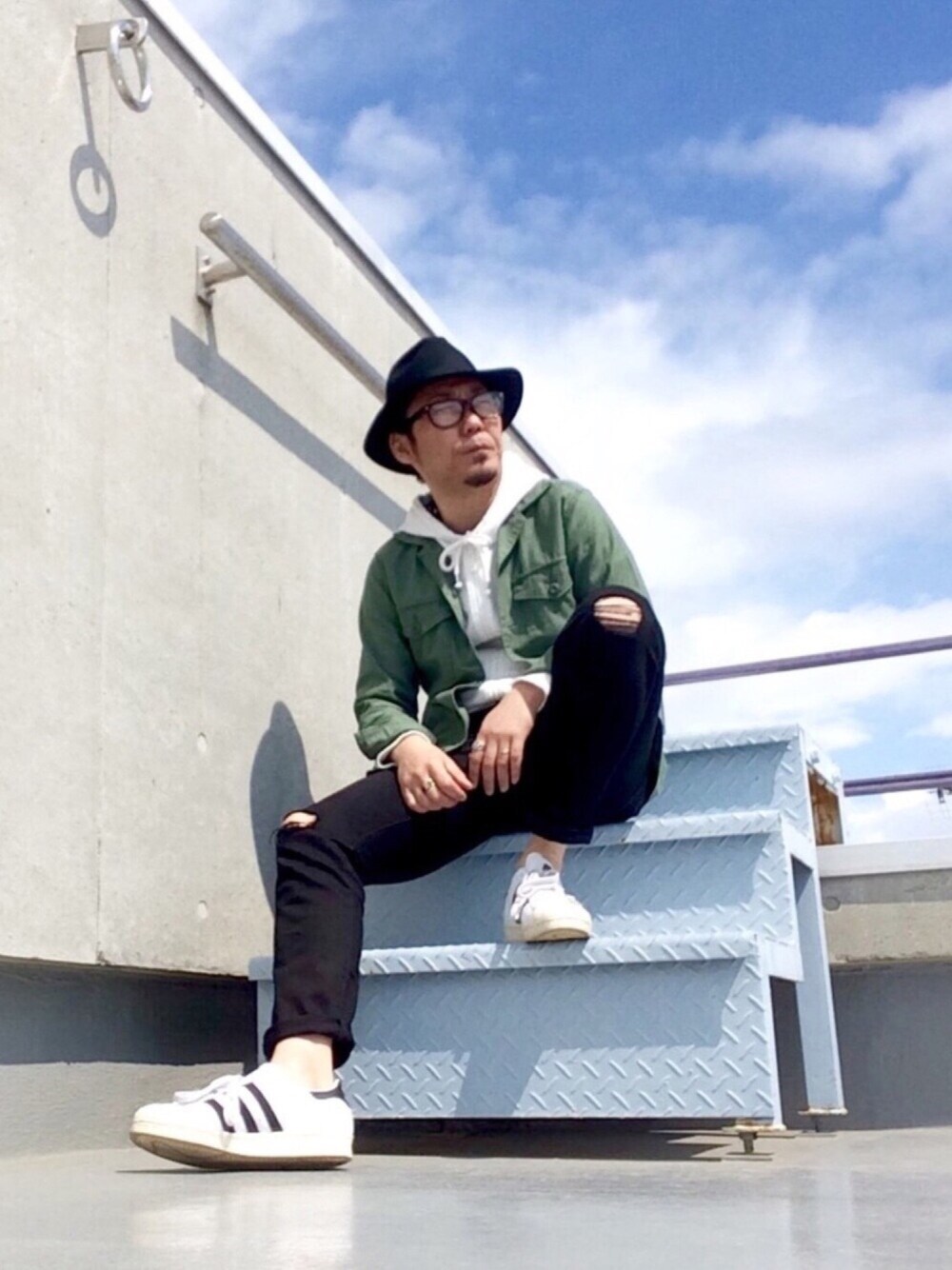 こんばんは🌆 今日のコーディネートは 昨日UNIQLOでゲットした 『ミリタリーシャツ✖️パーカー』春コーデ さらに、ブラックデニムで 黒フェス参加😆👍 たまには、座りポーズもいいかも😘 🌃