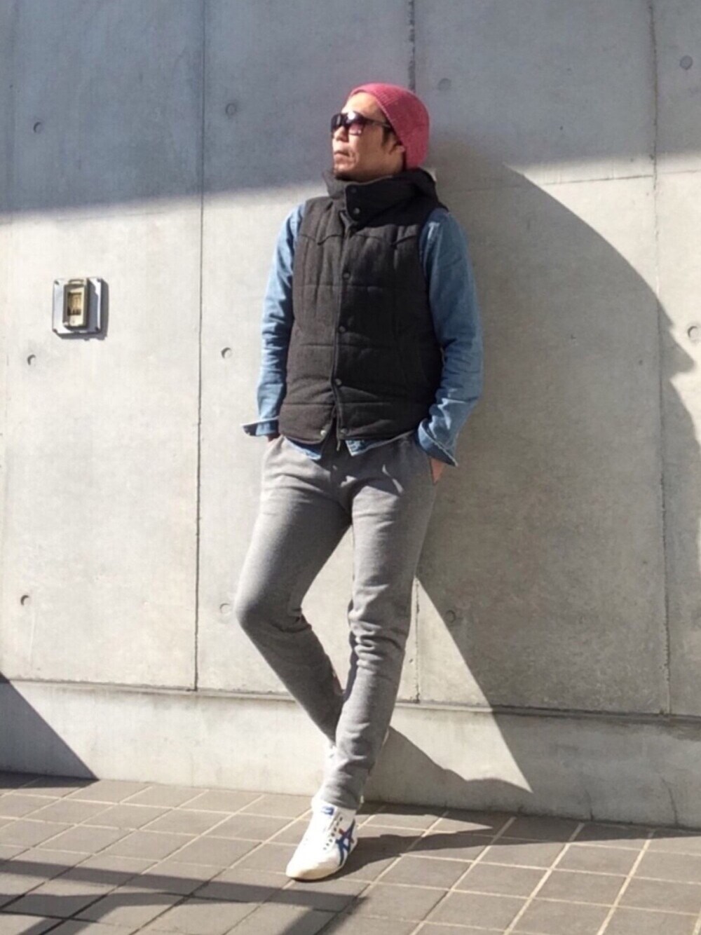 こんばんは🌆 また冬に逆戻り、寒い❄️ 今日のコーディネート 『中綿ベスト✖️ダンガリーシャツ✖️スウェットパンツ』 最近、スウェットパンツのリブを中に折り込んで履いている😆👍 中々この履きかた💮