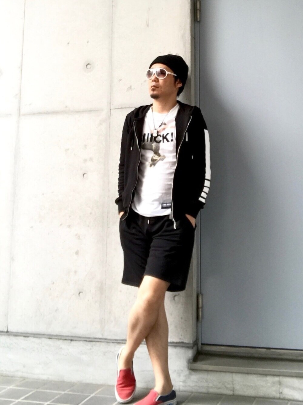 こんばんは〜🌃 春ですね〜 暖かくなりましたね〜😌 \ハーパン解禁/ 『モエスポセットアップコーデ』 ブラック✖️レッド 足元差し色レッド👟 Instagram➡︎crowd0614