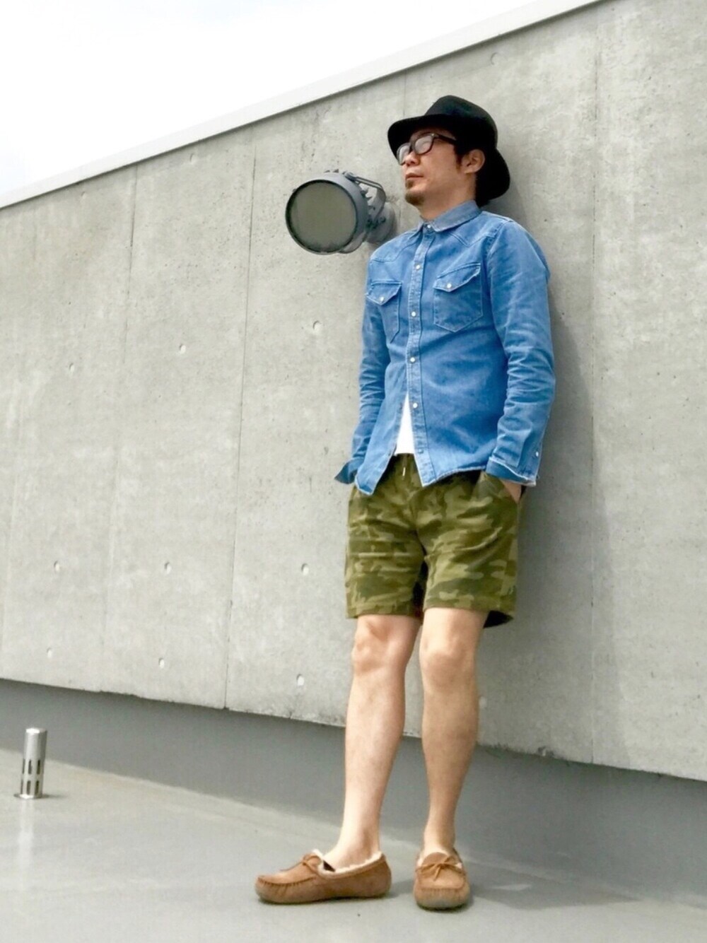 こんばんは🌃 今日のコーディネートは 少し寒いけど… 『ダンガリーシャツ✖️カモフラハーパン』の 春コーデ🌸 好きなコーデ😆👍 ポイントは、カジュアルになり過ぎないように ハット➕伊達メガネ👓➕モカシン 最近お気に入りのハット➕伊達メガネ🤣✨ Instagram➡︎crowd0614