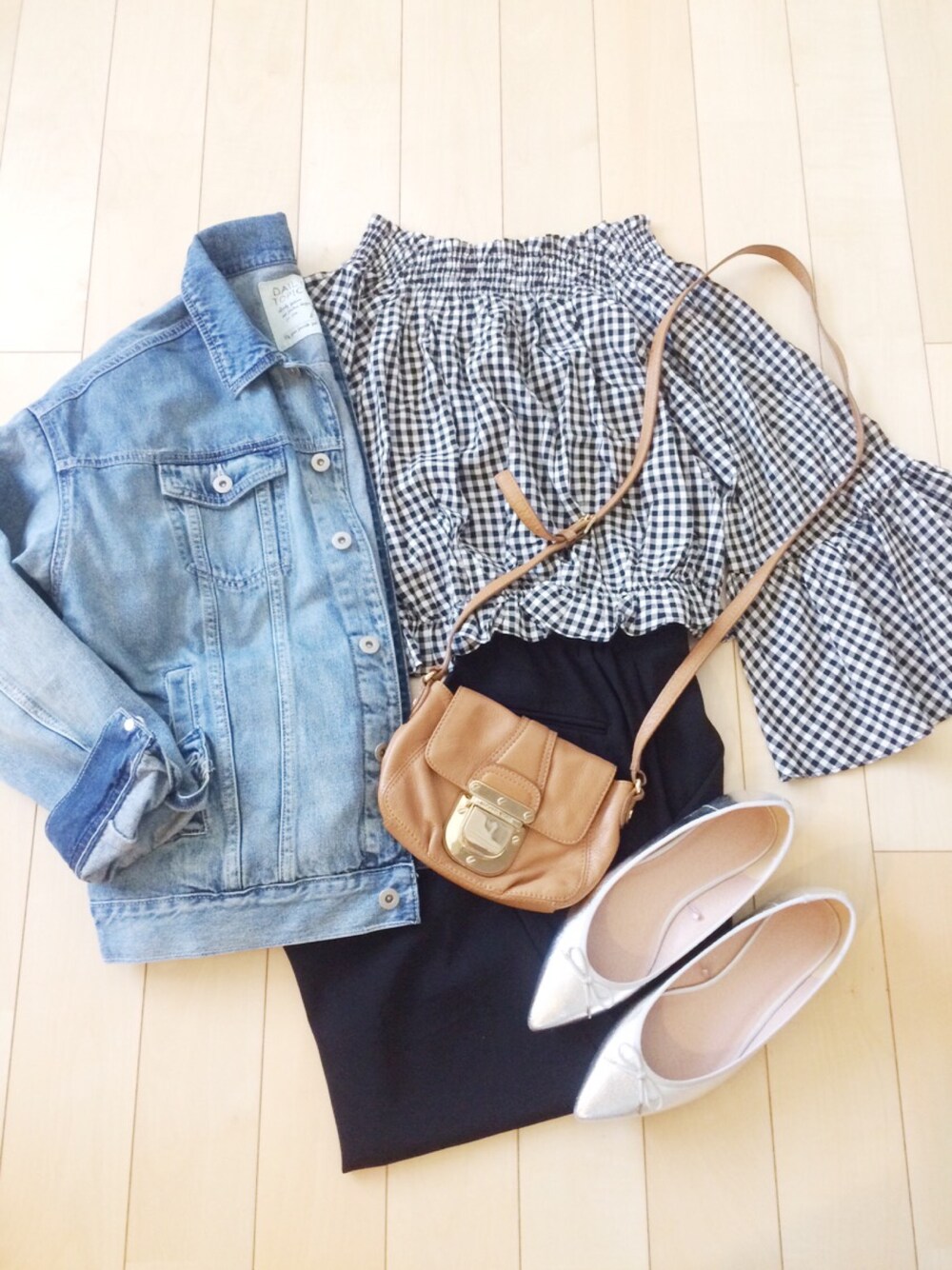 ギンガムチェックのオフショルにもなるトップスが主役😁