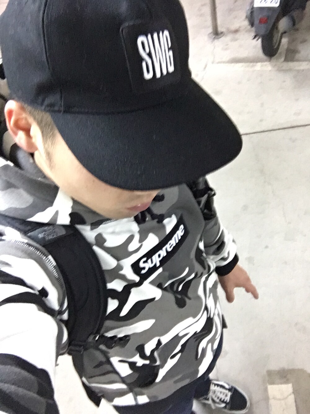 グレー系のパーカー、ブラック系のスニーカーを着用したメンズの秋コーディネートの1枚目の写真