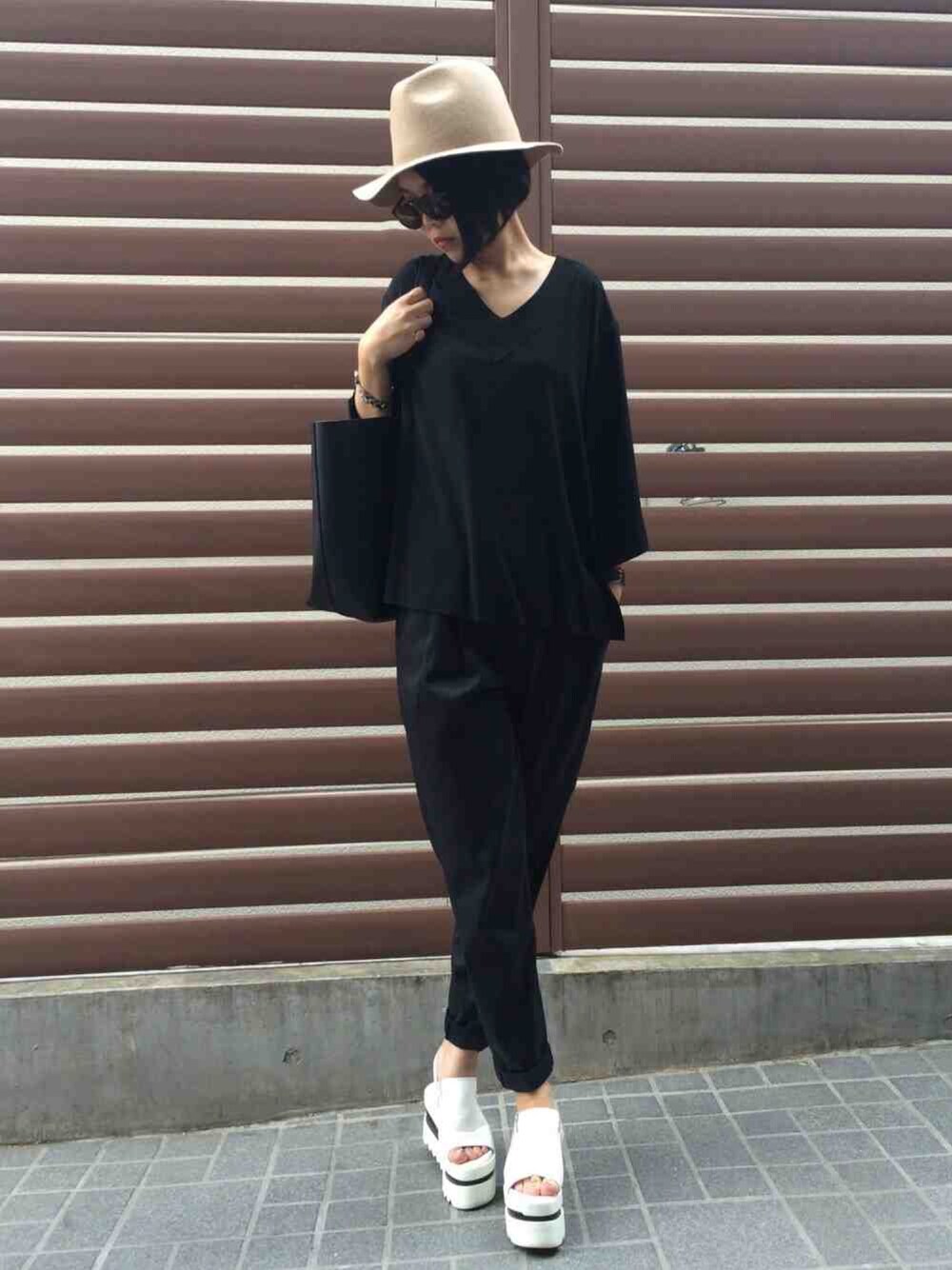 Vネックのとろみブラウスと落ち感テーパードパンツでALL BLACK STYLE。 キャメルのハットで早くも秋先取り気分です!