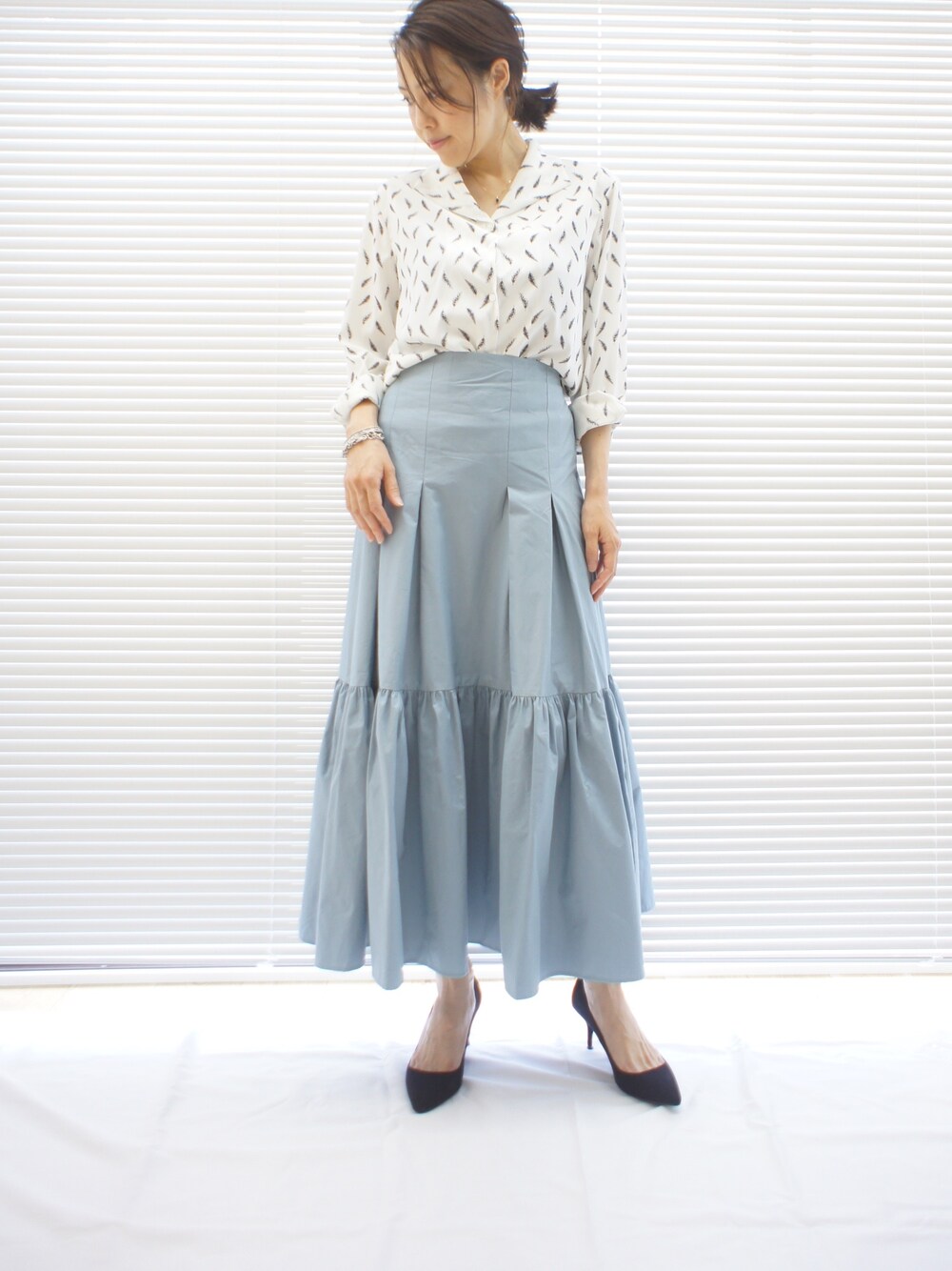 STANFOLANのマキシスカートを主役に♡ トップスもフェザー柄のブラウスで今年っぽく。
