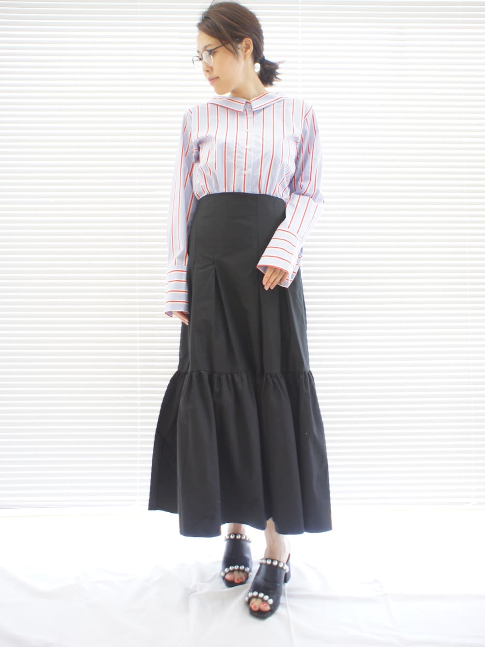 STANFOLANのマキシスカートは黒でもボリューミーで存在感のあるデザインが◎夏らしくストライプシャツで軽さを出して…