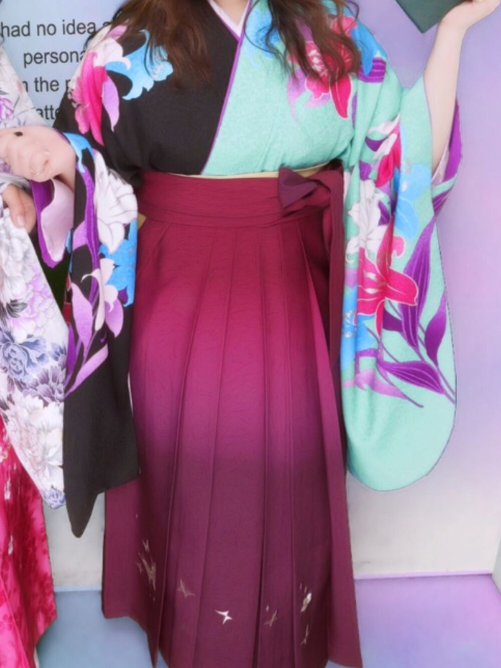 卒業式でした。 学生生活終了です。 半分は明るめの黄緑で、もう半分は黒で色が違うものにしてみました( ᵒ̴̶̷̤໐ᵒ̴̶̷̤ ) 袴は蝶々が付いていてグラデーションにしてみました\❤︎/