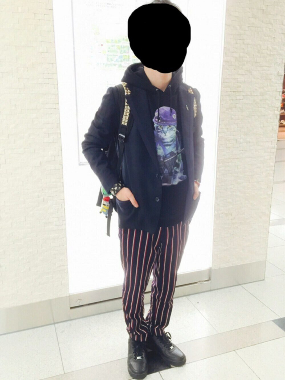 MILK BOYのブラックウォッチ柄のジャケットに音符のピンブローチを付けました♪ 全体的にプレッピーな雰囲気にしてからの猫パーカー☺︎