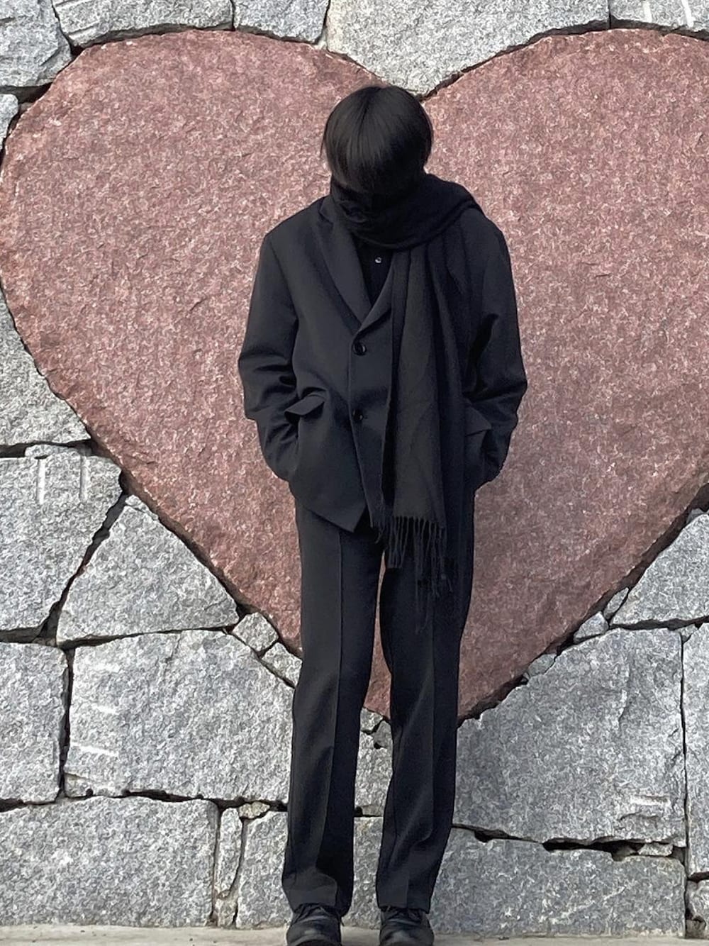 初詣の時に神社にいい背景の所があったので撮影してきました。 コンクリートにハートで演技良さそう。 今回のコーデはセットアップにマフラーで韓国系かつ忍者みたいなコーデを意識しました。寒い冬には少しきついジャケットコーデなので中にヒートテックやハイネックをしっかり着込んでます。 セットアップは、かっちりとした印象になりがちですがダブルにすることで普段着にも使えてオススメです。 とりあえず着るだけである程度コーデが様になります。 今回も最後まで見てくださり ありがとうございました! 【その他SNS】 TikTok▷▶︎▷▶︎@t_suda93 Instagram▷▶︎▷▶︎@t_suda93 フォロワー5000人目指してるので こちらもフォローの方宜しくお願いします。 contact▷▶︎▷▶︎DMまで!