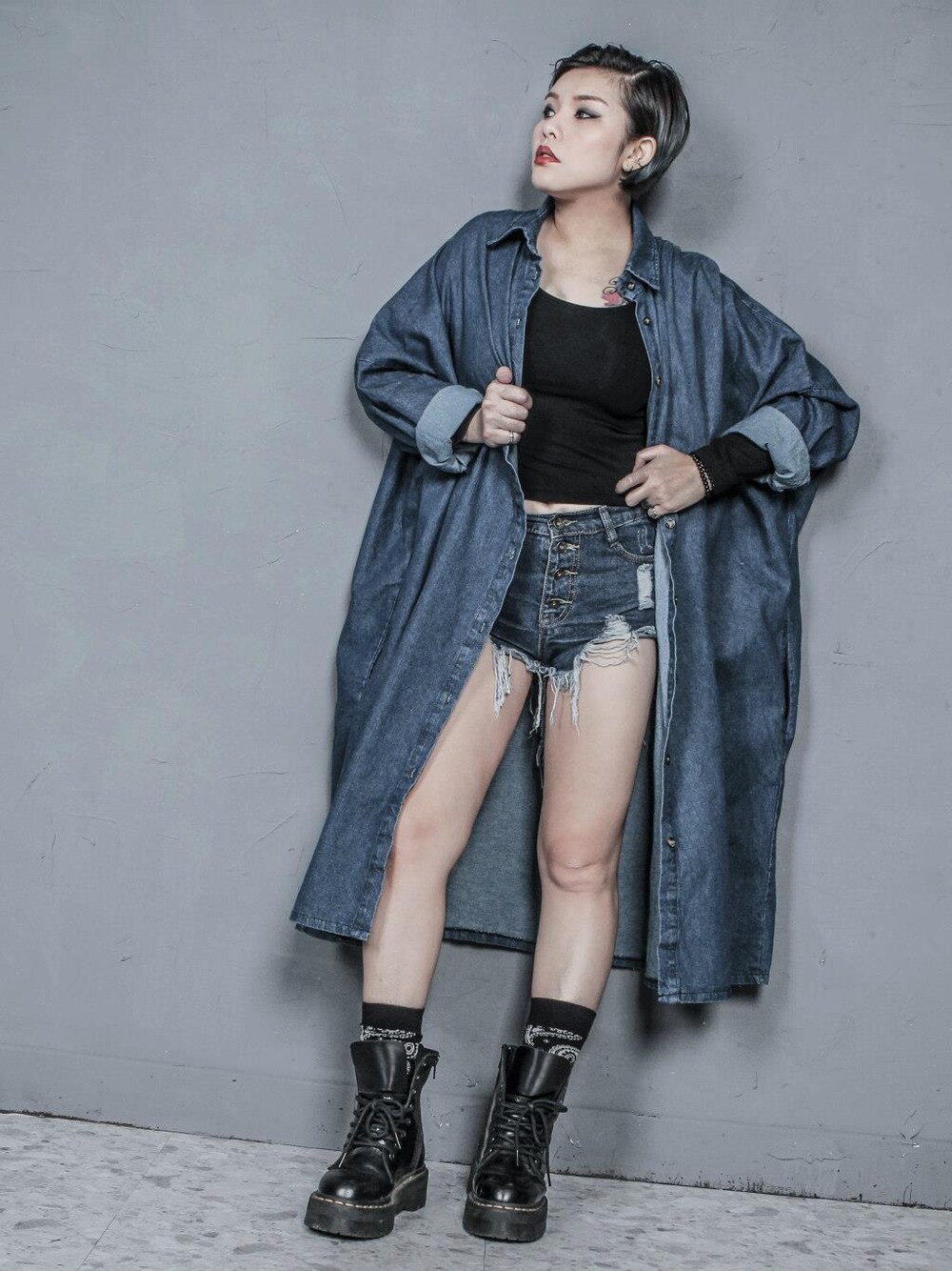 羊小羊のシャツ/ブラウス「歐美時尚街頭寬版飛鼠牛仔襯衫外套」を使ったコーディネート