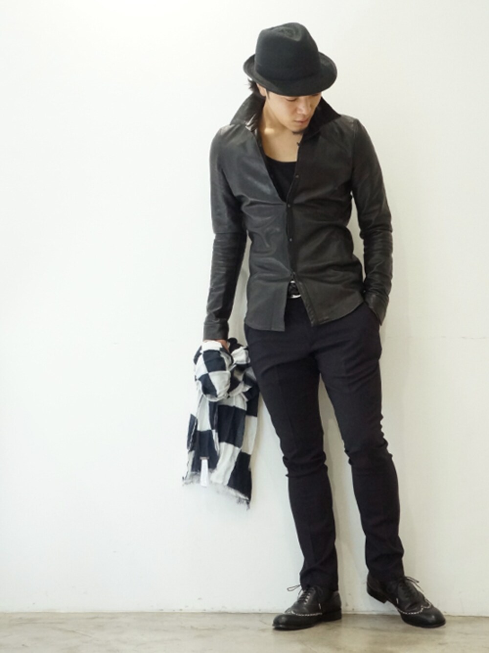 吟面が細かく、艶の美しいアフリカ原皮の羊革を使用したLEATHER SHIRTS。PANTSはNEW SIDE RIB PANTSのNAVYで少し色合いで変化を付け、HAT・BELT・靴はBLACKで統一してSIMPLEに仕上げています。手に持っているのはFaliero Sarti のCOTTON / SILK のSTOLE。 <使用品番> ■LEATHER SHIRTS LET004L04 / BLACK / 3 / ¥150,000+tax → ¥105,000+tax ■NEW SIDE RIB PANTS【NAGOYA LIMITED】 PNT1307040 / NAVY / 4 / ¥28,000+tax ■Faliero Sarti / MASTER E-14-1009 / BLUE / FREE / ¥42,000+tax ■A&E SMALL MESH BELT ACC0063A01 / BLACK / 4 / ¥24,000+tax ■WING CHIP SHOES SO02FCL02 / BLACK / 26.5cm / ¥58,000+tax ※写真モデル 榊原・身長170cm・体重67kg