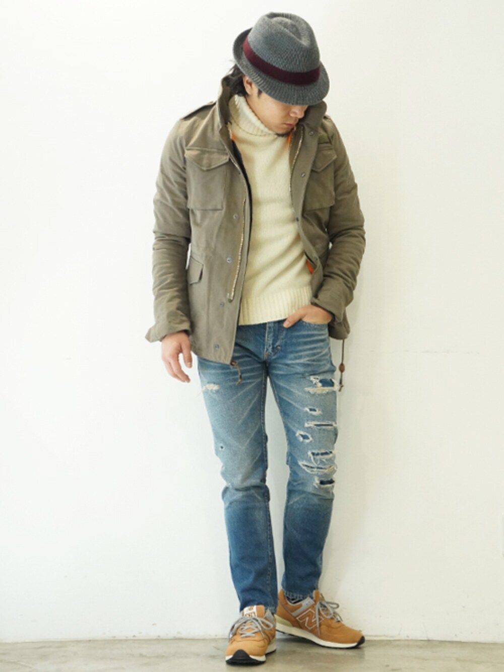 M-65やMA-1といったMILITARY要素の強いOUTERに、トレンド感のあるタートルネックを組み併せたスタイリング。PANTSはCRASH DENIM、足元はnew balanceでカジュアルな印象に仕上げてみました。KNITのOFF WHITEで清潔感をプラスし、new balanceの深みのある珍しい色合いで、さりげなく個性を出しているのがPOINTです。 <使用品番> ■M-65+MA-1 ※WEB未掲載品 size2・4…各1点のみ BLS1304005 / KHAKI / 2 / ¥148,000+tax → ¥103,600+tax【30%OFF】 ■POWDER TURTLE KNIT※WEB未掲載品 size2…1点、size3…2点 KNT1309002 / OFF WHITE / 3 / ¥29,000+tax → ¥20,300+tax【30%OFF】 ■NEW 505 CRASH DNM1308002 / BLUE / 4 / ¥40,000+tax → ¥28,000+tax【30%OFF】 ■2 TONE THERMO HAT HAT1313008 / D.GREY / 3 / ¥17,000+tax → ¥11,900+tax【30%OFF】 ■new balance M576 NTO / TOBACCO / 8.5 / ¥24,000+tax ※写真モデル 榊原・身長170cm・体重67kg