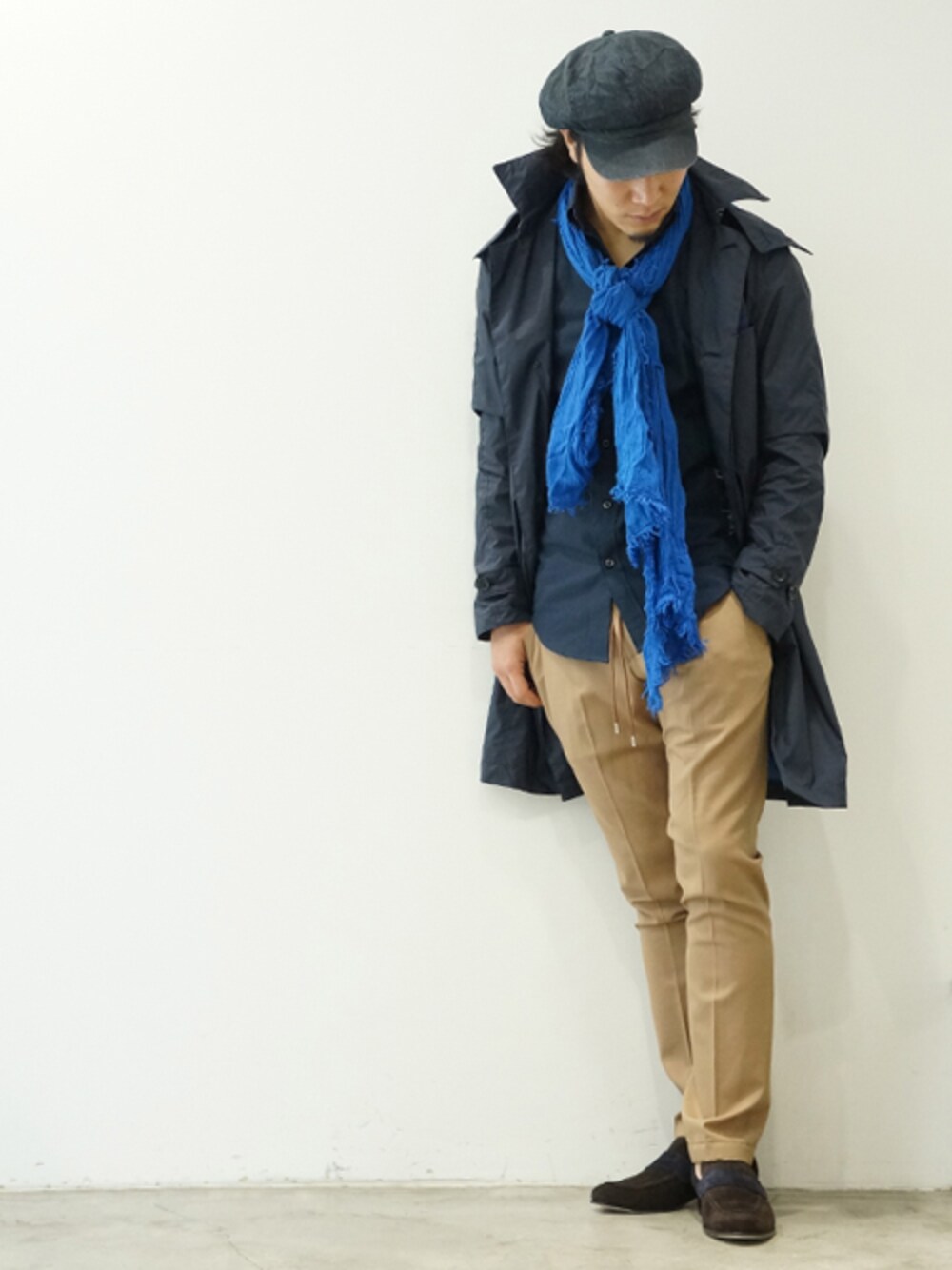 驚くほど軽い、CHANGE SLEEVE COAT。出がけにサッと羽織れるような質感は見た目とのGAPを楽しむ事が出来ます。今回は中にNAVYのSIDE JERSEY CAMO SHIRT、PANTSをBEIGEのSIDE RIB TROUSERを組み合わせています。BEIGEのPANTSというとチノパンが多いですが、今回のようにS'120 WOOL素材のモノに変えるだけで、見え方も変わります。 STOLEのBLUEがさりげないアクセントに。 <使用品番> ■CHANGE SLEEVE COAT COT002 / NAVY / 3 / ¥55,000+tax ■SIDE JERSEY CAMO SHIRT SHT008 / NAVY / 2 / ¥23,000+tax ■SIDE RIB TROUSER PNT025 / BEIGE / 3 / ¥33,000+tax ■ITALY VISCOSE 2WAY STOLE ACC040N01/ BLUE / FREE / ¥6,500+tax ■MOCCASIN SHO014 / BROWN / 2 / ¥58,000+tax ※写真モデル 榊原・身長170cm・体重67kg