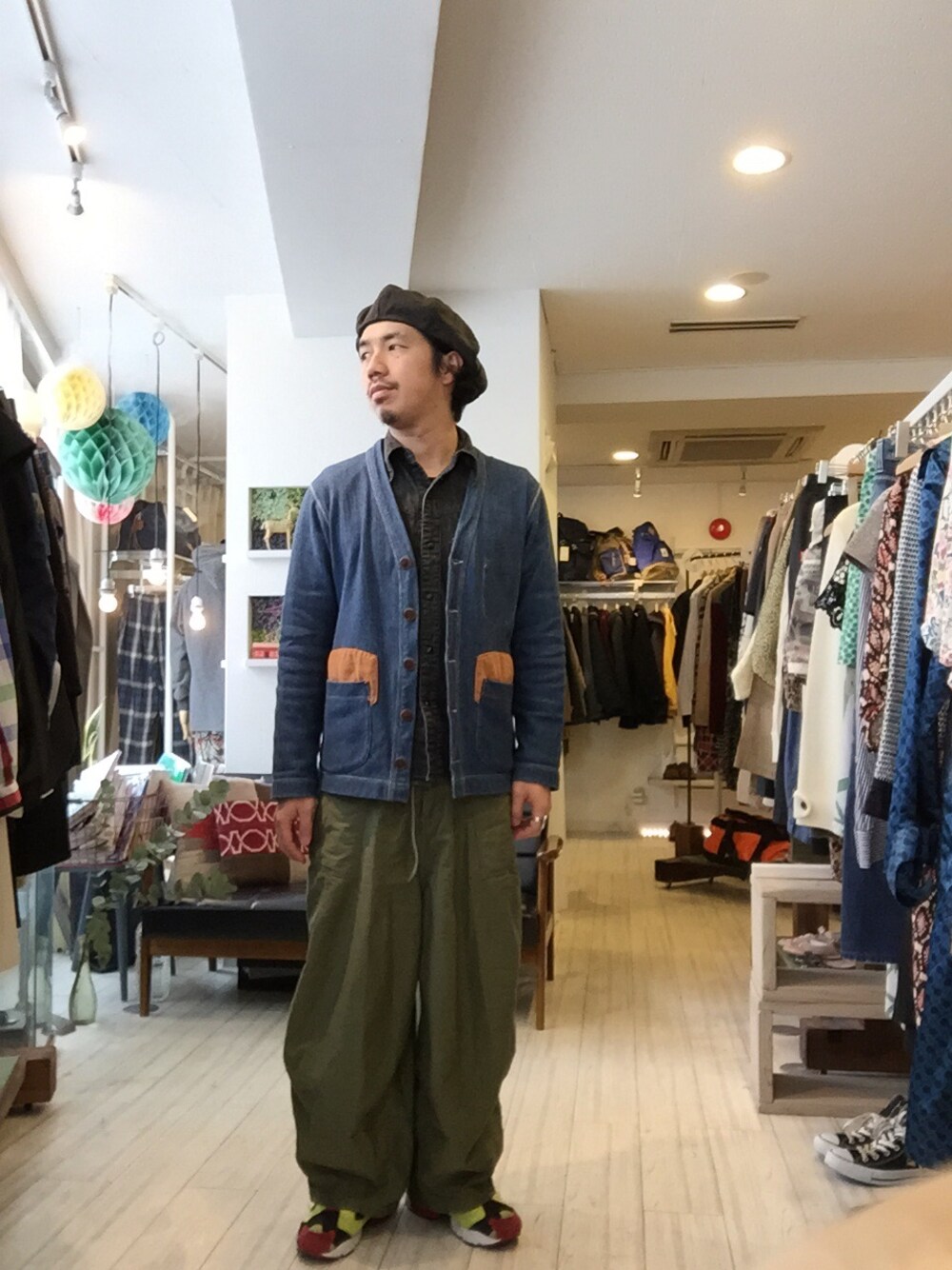 デニムシャツにインディゴスウェットのカーディガン。 ワイドパンツ。 なんか、どかちんみたいやん…