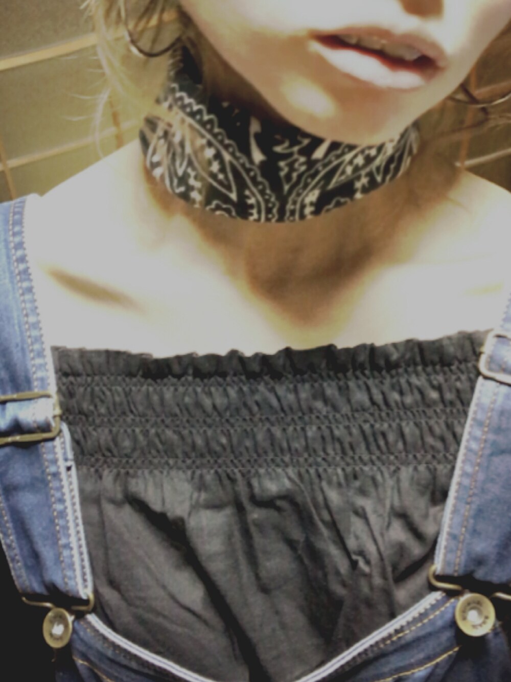 salopette × offshouldertops ヘアはぐりぐりに巻いて クセ毛風。この写真では見えな