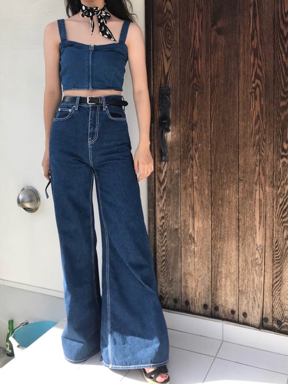 ワイドデニムはzaraのセールで2590円で買いました✨ トップスは夏らしくビスチェ一枚で、露出しすぎないようにボトムスはワイドデニムにしました✨ 下に広がってるベルボトムっぽいパンツが大好きなのでこの値段でこんな可愛いアイテムに出会えてよかったです😊 丈が長いのでサンダルで脚長効果が出来ます!