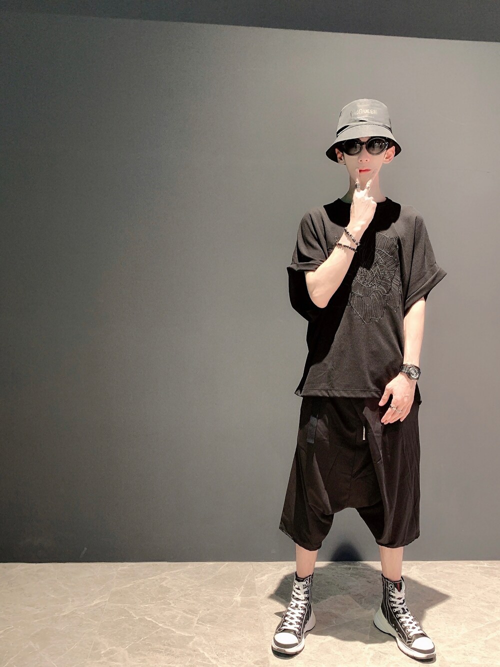 Hat:Alexander McQueen Sunglasses:Number (N)ine Bracelet:Alexander McQueen Rings:Alexander McQueen Watch:White Mountaineering x Seiko Shoes:Neil Barrett