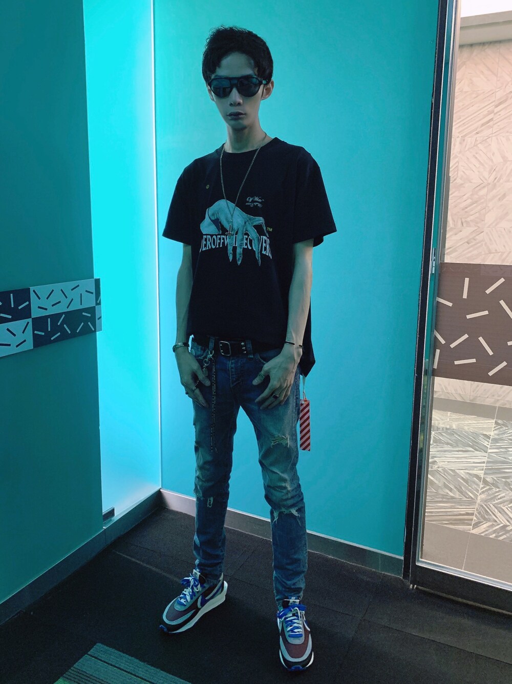 Sunglasses:MONCLER T-Shirt:UNDERCOVER x OFF-WHITE Belt:Hysteric Glamour Jeans:mastermind JAPAN Shoes:sacai x UNDERCOVER x Nike