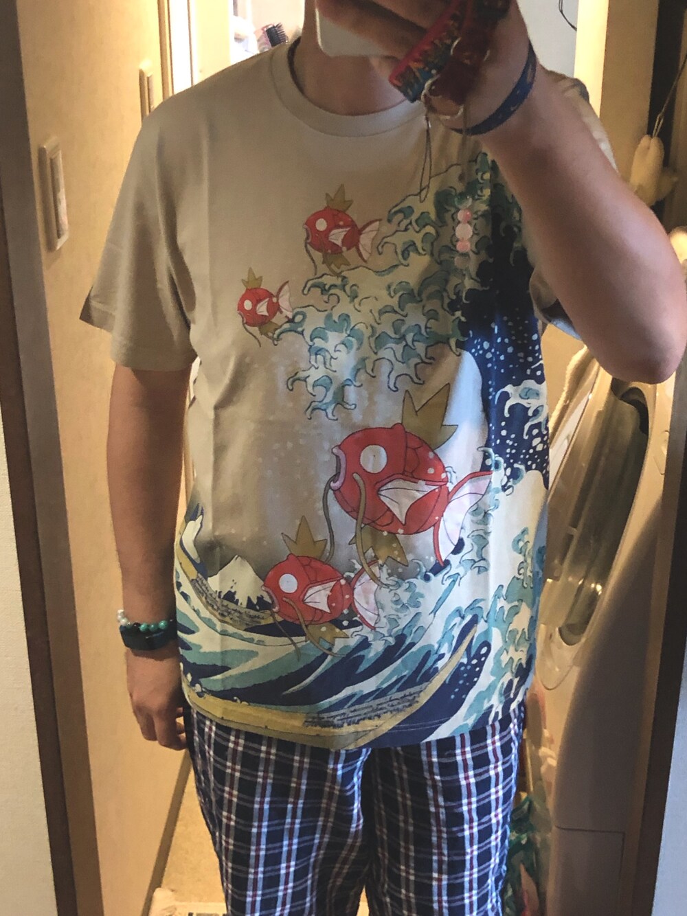 連投すみません。 ずぶ濡れからの部屋着です。 最弱ポケモン コイキングが好きなので買いました。推しのカビゴンも描かれてて俺得的なTシャツです。