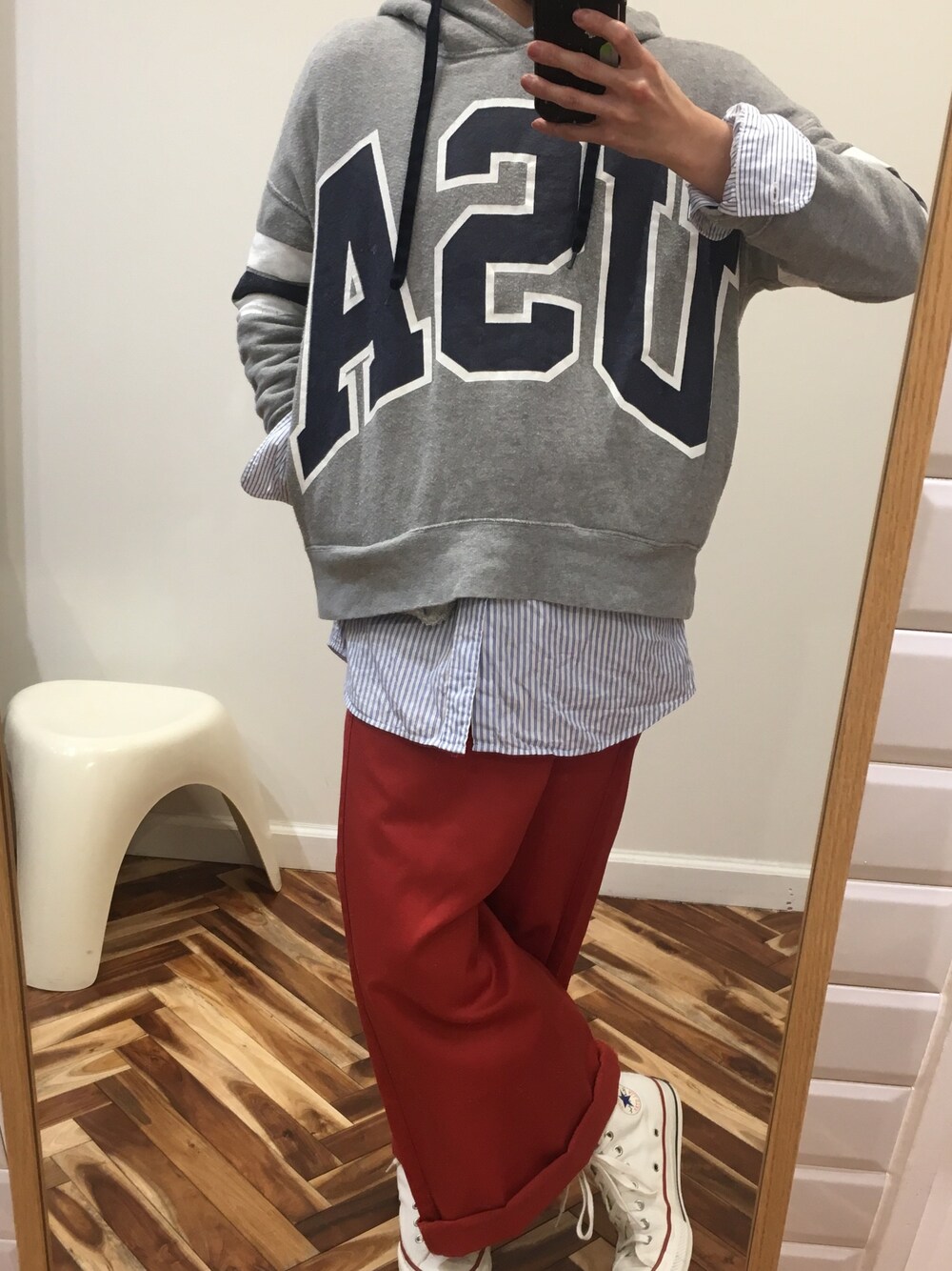 ショート丈のパーカーにシャツ合わせが好き👔