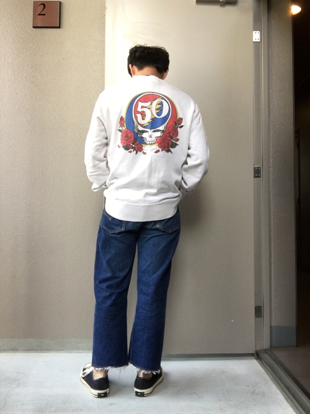 切りっぱなしデニムにスウェットにコンバース。アイテムとサイズ感で変化を。 プロフィールに古着のウェブショップのリンクを貼ってます。