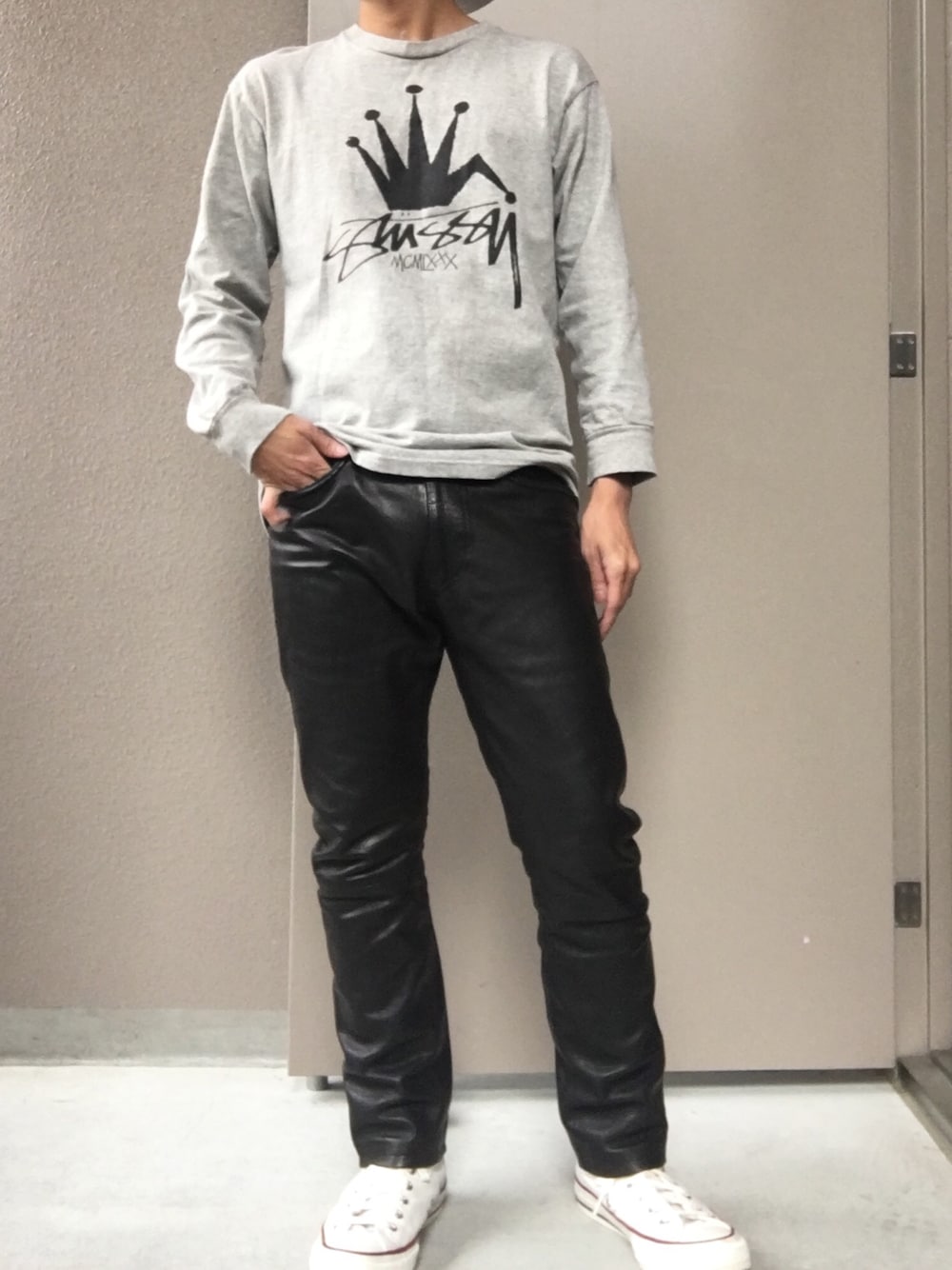 グレーに革パンは鉄板。 プロフィールに古着のウェブショップのリンクを貼ってます。