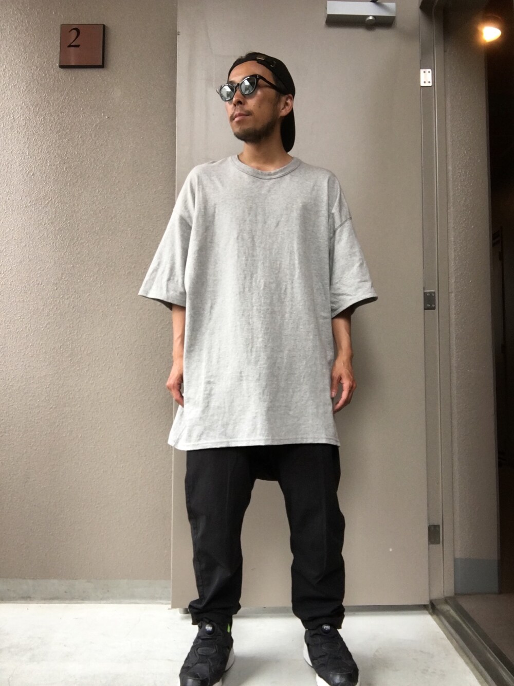 チャンピオンのチープなTシャツにイタリア製のサルエルパンツいい感じ。