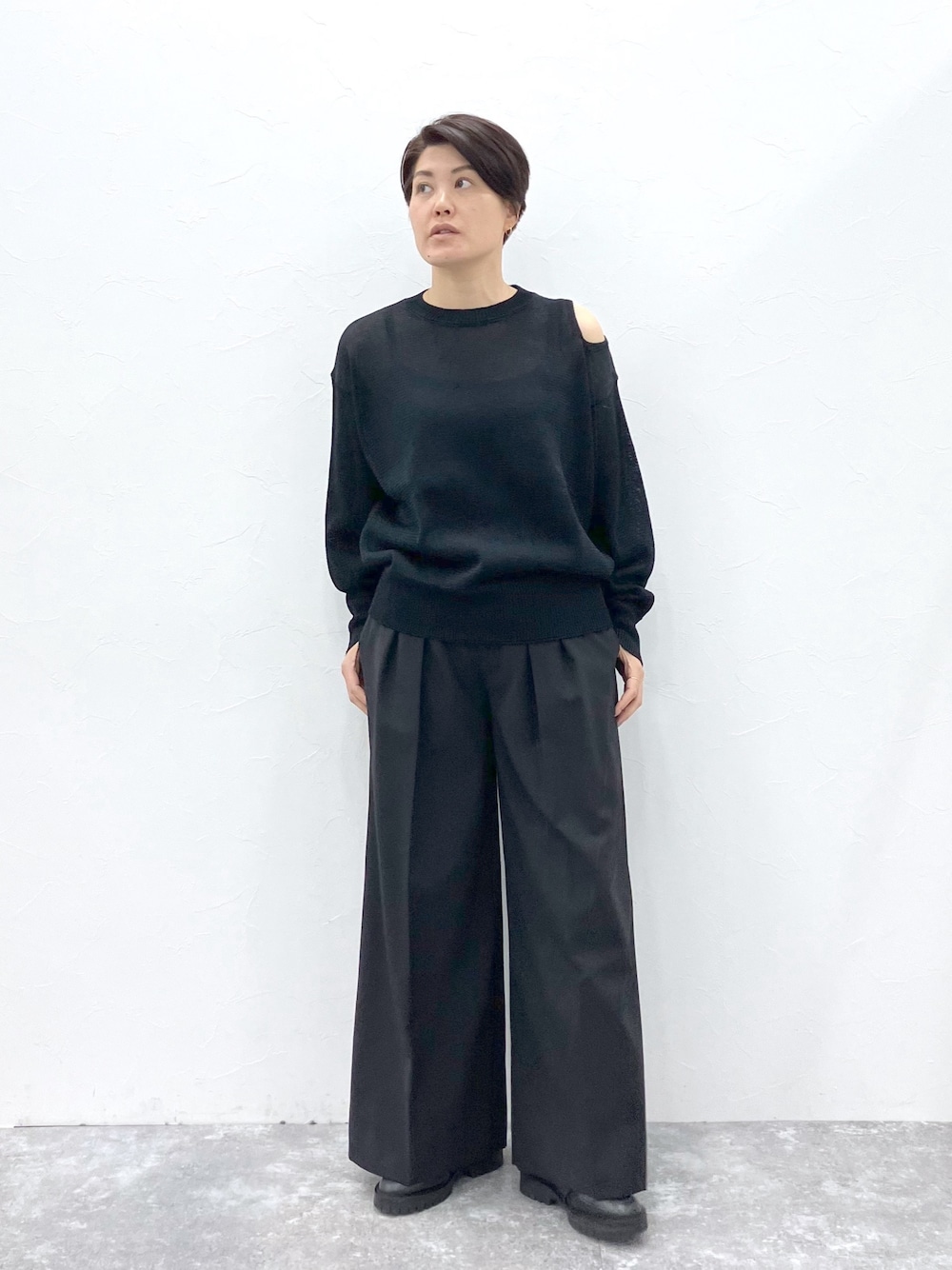 モードなサマーブラックスタイル。 体に程よくフィットするプルオーバーに対して、ボリュームのあるワイドパンツを合わせることで、トップスをインしなくてもバランス良く見せてくれます。 パンツはウエスト位置を少し落として着ていただくのがおすすめです。 【着用サイズ】 トップス:Lサイズ ジャストサイズ パンツ:Lサイズ ジャストサイズ Instagramはこちら: @sternberg.jp