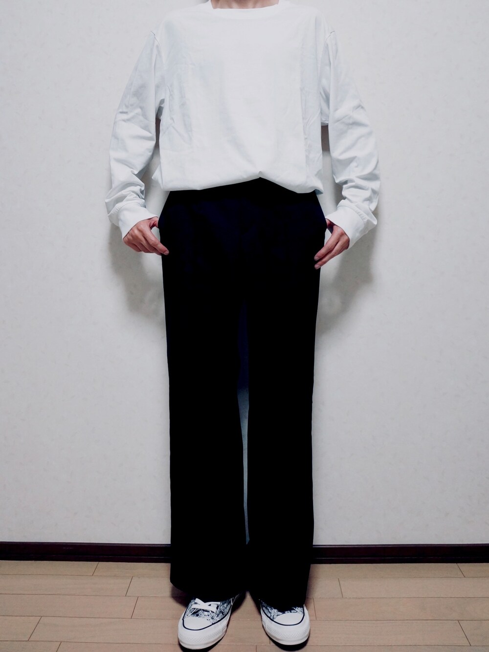 Tシャツ→エアリズムUVカットクルーネックT(XL) パンツ→ユニクロワイドパンツ(レディースM) スニーカー→パイソン柄オールスター