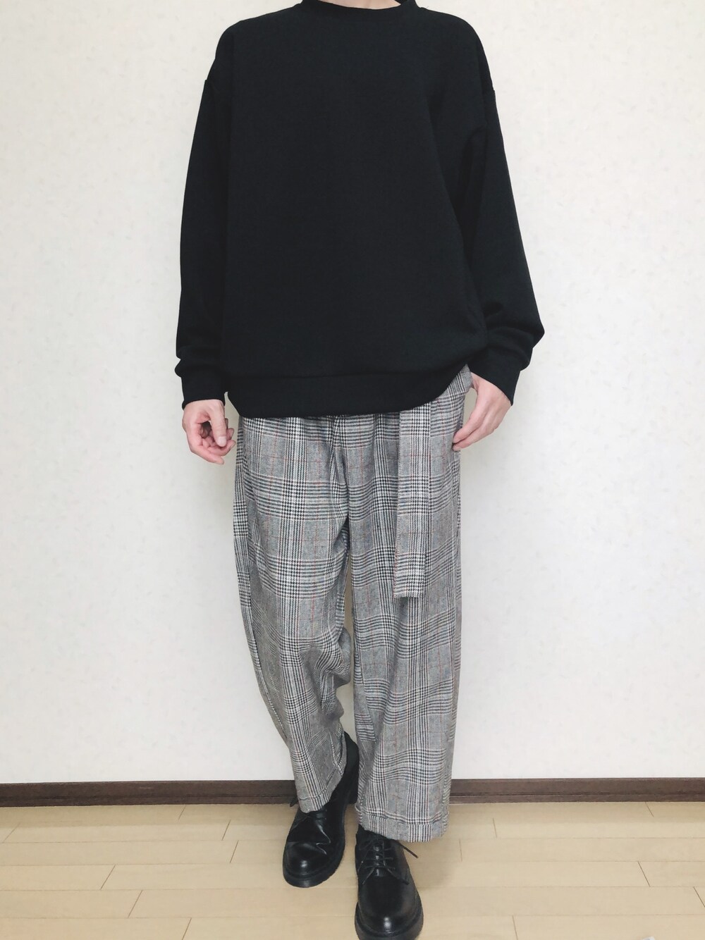 Tops→ ダブルフェイスビッグプルオーバー(M) Pants→ loose wide check PT/ルーズワイドチェックパンツ(S) Shoes→ オックスフォードシューズ(レディースXL)