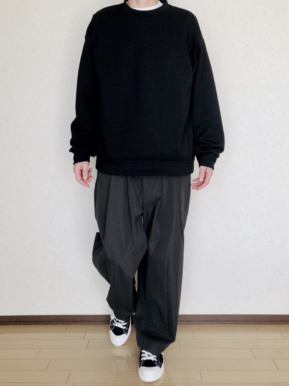 Tops→ ダブルフェイスビッグプルオーバー(M) Pants→ loose tapered wide PT / ルーズテーパードワイドパンツ(S) shoes→ 疲れにくい撥水スニーカー 25.0cm・黒