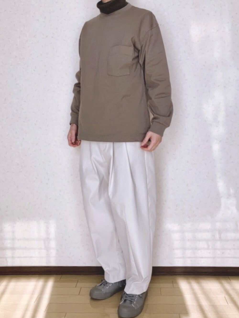 inner→ヒートテックフリースタートルネックT(XL) TOPS→ユニクロU クルーネックT(M) PANTS→ルーズテーパードワイドパンツ(S) SHOES→疲れにくい撥水スニーカー25cm・グレー
