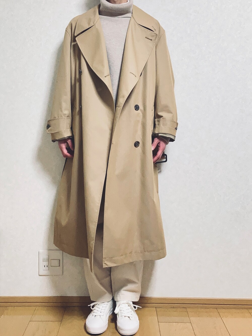 coat→ユニクロU トレンチコート(S) TOPS→MILANO RIB HEAVY WEIGHT TURTLE ベージュ(M) PANTS→GU デニムシェフパンツ白(S) SHOES→ユニクロ コットンキャンバススニーカー