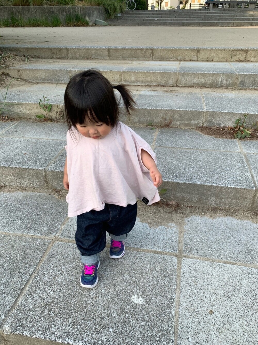 だぼっとサイズがとっても可愛い😍 パンツもゆるっとふわっとで ジーンズなのに 動きやすい🎵 オシャレを忘れない 公園スタイル(^^)