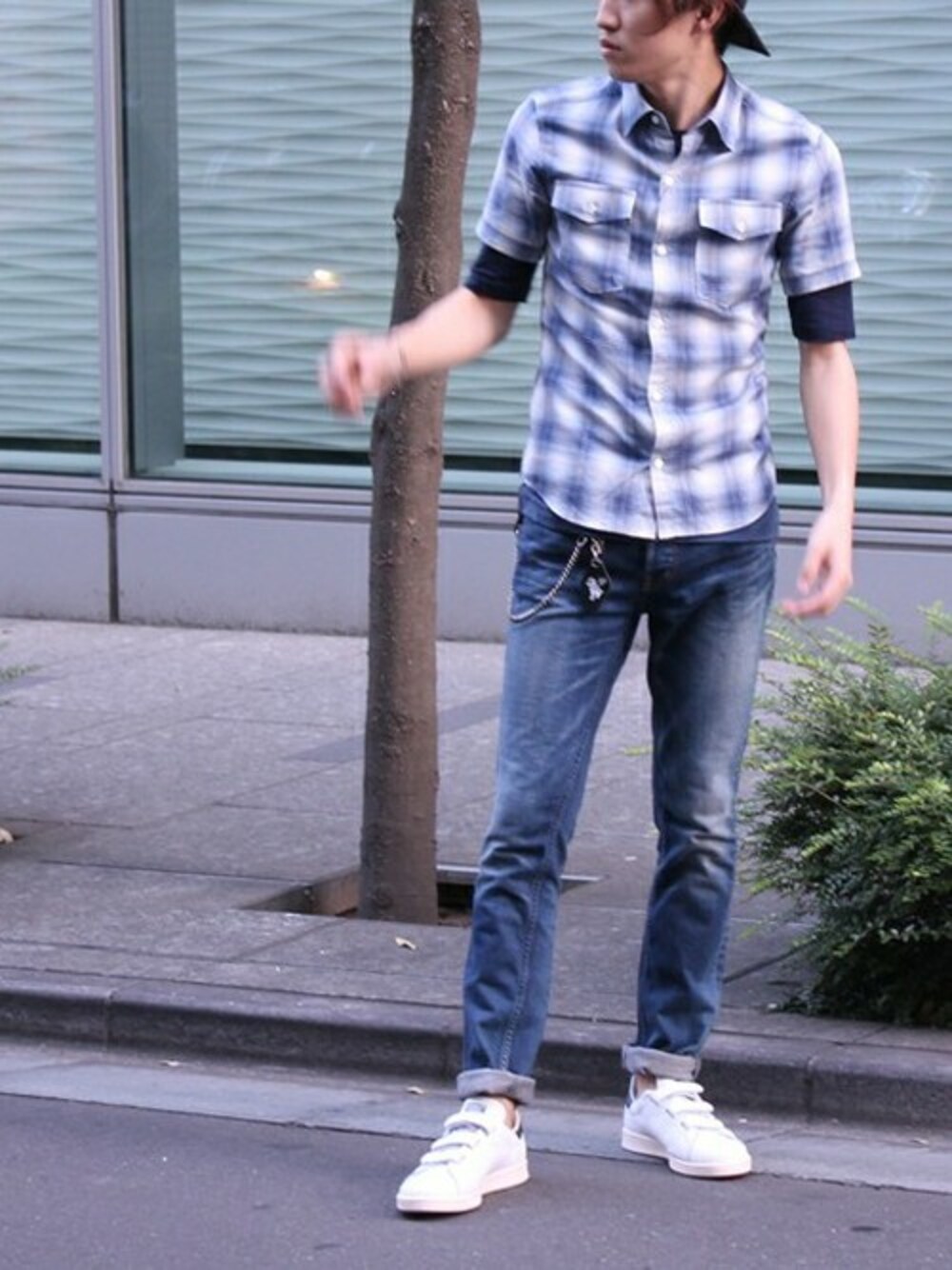 トップスには爽やかなオンブレチェックシャツに今の時期にピッタリな5分袖カットソーをレイヤードしたスタイル。 今季は半袖シャツに5分丈や7分丈といった長めのカットソーをインナーにしたスタイルがトレンドとなっており袖でもレイヤードが楽しめます。