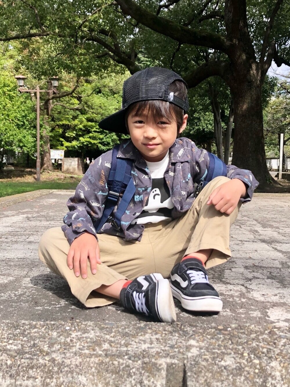 妄想通学コーデ❤️ 小学校の学校見学の日の服! リュックにも荷物沢山詰めて、ちゃんと一人で歩いて行けるかしてみたよー😆 小学校まで、徒歩5分! 道はマンション前の緑道公園に入って、一本道! 1人では行けないそうです🤣行けよ!行けるよww ちょっとストリートを意識してコーデしてみたよ✨ 憧れのゴンザレスTが770円で手に入ったのー!生地も良さそう💕 けいけいともお揃いのスケボーシャツを羽織って、ソックスでオレンジをチラッと🧡 小学校までは1人で行けないチキンだけど🐓成長したなぁ😭 卒園の用意で小さい時の写真とかも最近見ることあって、より感慨深いわ☺️