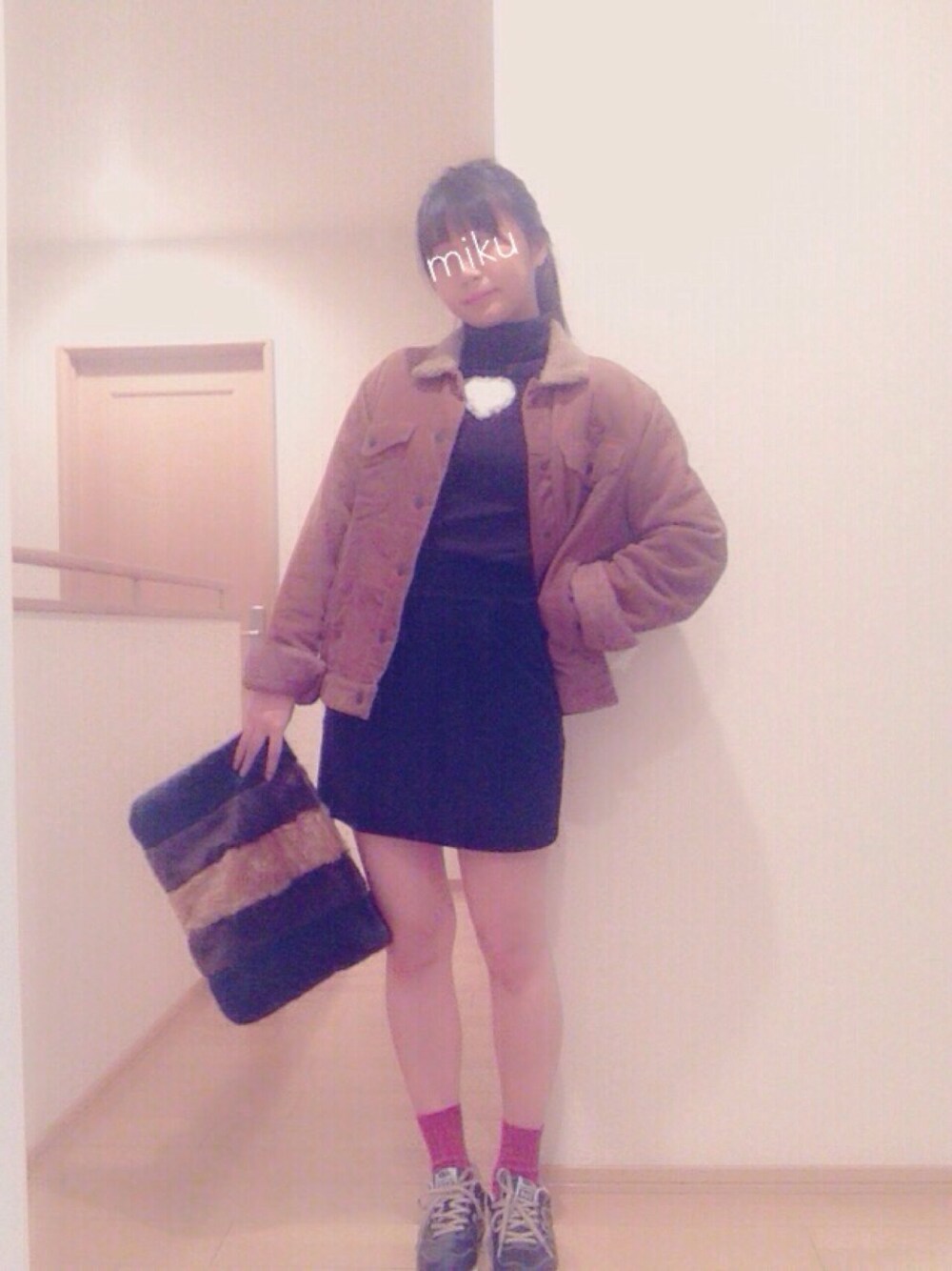 新しい感じ◎ アウターを少しビックサイズにして 冬だからもこもこも取り入れて 首元あったか〜 全体的に暗めで統一して差し色にピンクの靴下! 服の感じが茶色×黒だからファークラッチも茶色×黒で◯