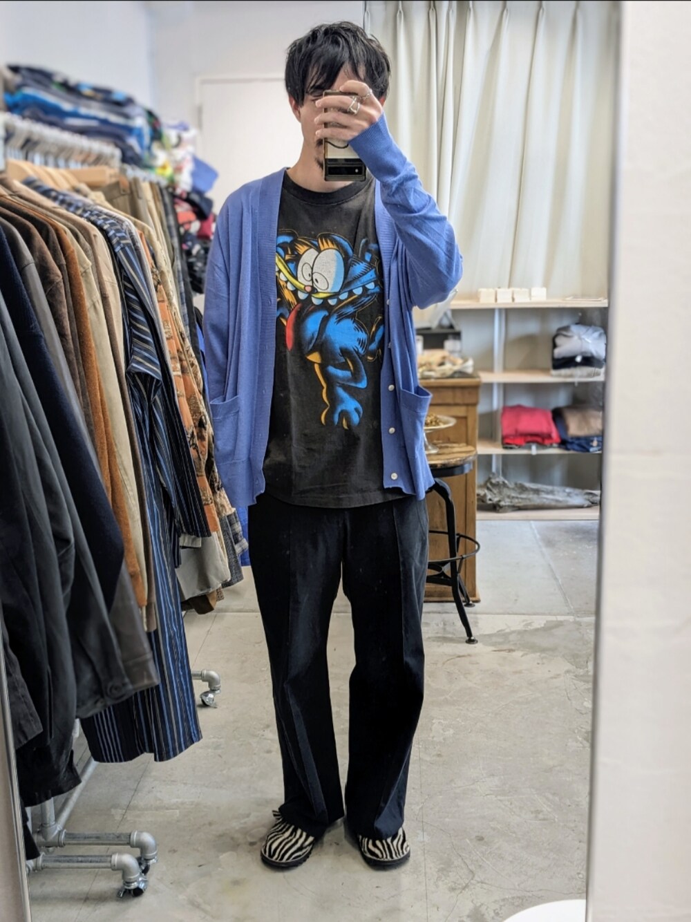 【スタイリング日記】 3/18(月)晴れ インナーはやっぱりふざけたTシャツ。 足元にはゼブラ。 CARDIGAN #maateeandsons BOTTOM #odem INNER #used #古着 #下北沢 #vintage #shimokitazawa #スタイリング日記