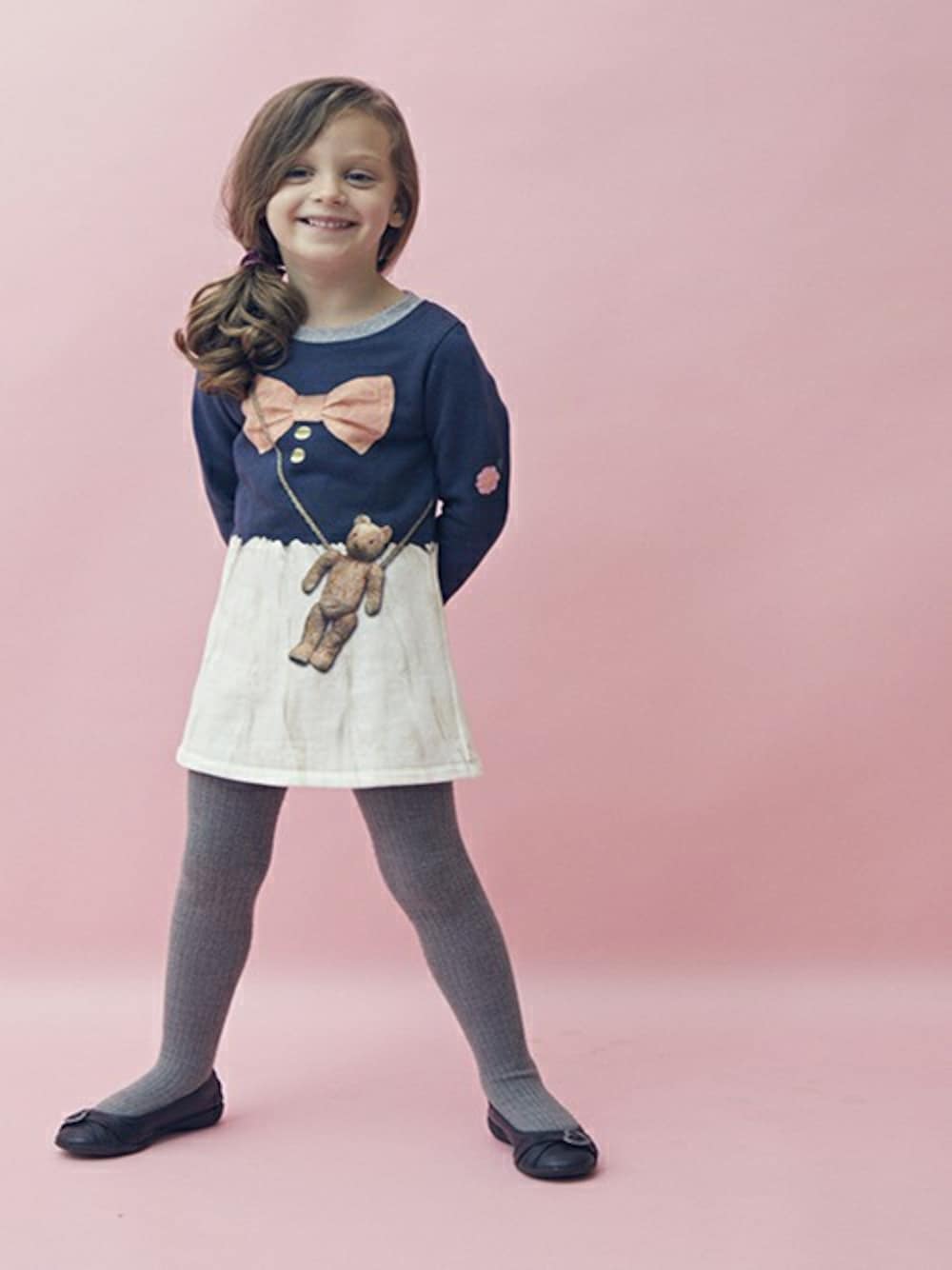 定番人気のリアルな転写プリントでニットワンピースを表現! クマのポシェットがアクセントになっているのがポイント! リアルな転写プリントがキュートなワンピース♪ やわらかな肌触りで着心地の良い、スウェット素材を使用しています。 トップス部分は胸元に大きなリボンと金ボタン、袖部分の切り替えやバックリボンなど、可愛らしいモチーフプリントを散りばめた遊び心が溢れたデザインです。 ふんわりと軽やかなイメージのレーススカートプリントも、プリーツの表現する絶妙なニュアンスがリアルに再現されています。 チェーンベルトを使用したクマのポシェットが愛らしいアクセント。 1枚で存在感を放つアイテムです!