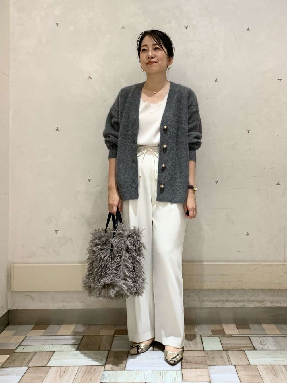 Ishikawa(ノーリーズソフィーアトレ恵比寿店)のカーディガン/ボレロ「ヘアリーVネックカーディガン」を使ったコーディネート