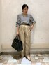 チノパンで作るカジュアル通勤コーデ。 ベルトや革バッグできちんと感出せます。 ブラウスは袖のタックが可愛い1枚。 オススメです。