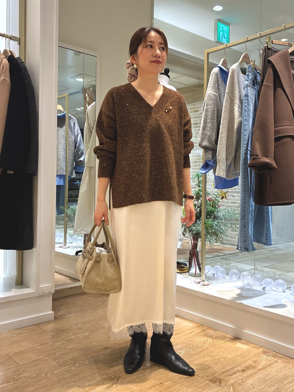 ラメとスパンコールが煌めく華やかニットはデイリーだけど年末年始のちょっとしたお出掛けにピッタリです。 中にレースのキャミワンピースを着てます。