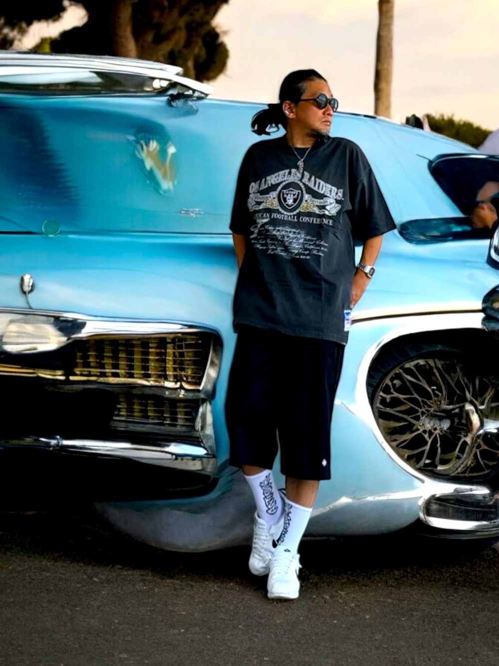 先日、wear友さんであるマングースさんに チカーノファッションにチャレンジしてみては? と、アドバイス頂きまして、 チカーノの文化、成り立ちetc 色々調べてました✨ そして、 自分のワードローブからアイテムを ピックしてたんですが、 コルテッツとディッキーズは⭕️ ソックスだけが見つからない… そもそも、長めのソックスは 持ってないしなぁ… と思っていたら そうだ、ハッシーさんから頂いた 白がある!ということで、 スタイリングしました🤩👍 西海岸のギャングスタイルは、 タトゥーとも密接に関係します✨ なので、タトゥーなイメージを Tシャツとソックスで表現 してみました✨ ローライダーの車を背景に すれば、雰囲気抜群です👍👍 UFOぽいですが🤣🤣 いつもご覧頂き有難うございます。