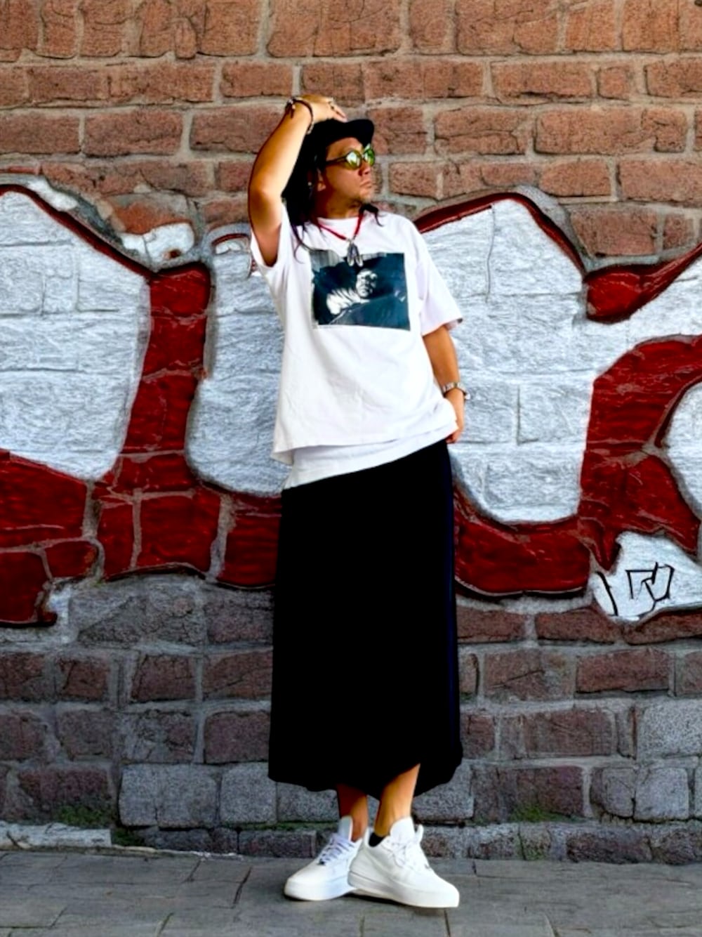頂いたNITRAID × EXPANSIONの マイクタイソンTシャツ✨ 自分は短丈、ボックス型のTシャツが 好きなので、普段から魔改造するんですが 今回も同じく、 丈を詰めて、身幅を広げるという魔改造を 施しました(丈60cm身幅57cm)🤩 たぶん、ハッシーさんの投稿時より ボクシーなシルエットになってると 思います👍 タイソンのフォトは、ラバープリントで 質感が重厚、タイソンの強さが全面に 押し出されます🤔 なので、 ハーパンやデニムで合わせるより、 モードストリートで意外性を 持たせたく、 ヨージの袴をチョイスしました✨ 何より、 ニトロアンダーグランドの白いAF1の 逸話を伺っていたので、 白いAF1もチョイスしてリスペクトを👍 普段使いしにくい ゴツいイーグルフェザーのインディアンジュエリーは タイソンだからこそ全く無問題🤣🤣 ちょうどこのプリントのタイソンもゴツいネックレスを してるので、オマージュです✨ 普段、自分は、 古着屋さんでの購入がメインなので まず、nitraidのTシャツとは出会えない のですが、ハッシーさんのおかげで むっちゃ新鮮な出会いができました🙏 改めてハッシーさん、有難うございました! wearで沢山コラボさせて頂きましたが、 これが、真のコラボかもしれませんね✨ いつもご覧頂き有難うございます!
