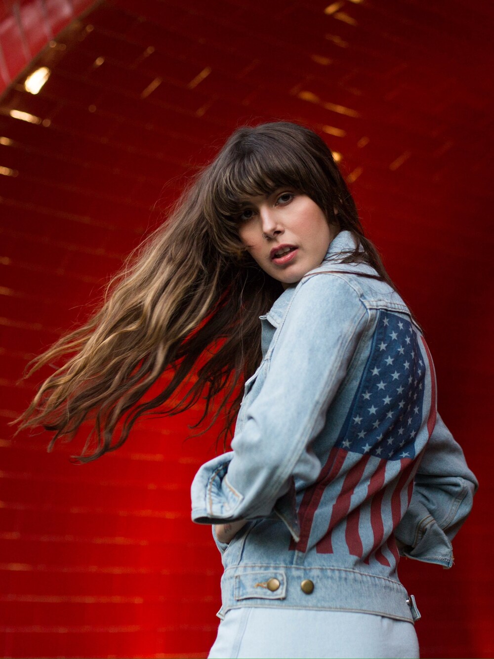 ブルー系のデニムジャケットを着用したレディースの秋コーディネートの1枚目の写真
