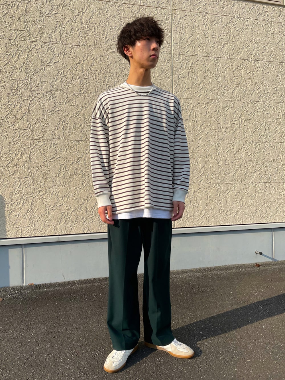 ボーダー✖️カラースラックス トップスはレディースのものを拝借。 丈は若干短いのでTシャツでレイヤードしてます◎ グリーンスラックス意外と合わせやすいので重宝してます👍